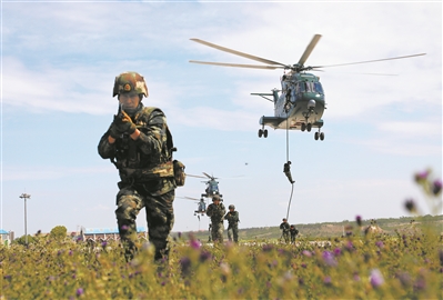 圖為直升機飛抵目標區(qū)域上空,特戰(zhàn)隊員索降而下。張曦 攝