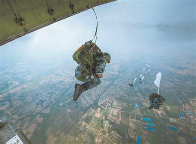上午8時(shí)許,滿載傘兵的運(yùn)輸機(jī)騰空而起。到達(dá)預(yù)定空域后,傘兵們聽(tīng)從投放員口令,成雙路隊(duì)形依次躍出機(jī)艙。瞬時(shí),朵朵傘花綻放于藍(lán)天。