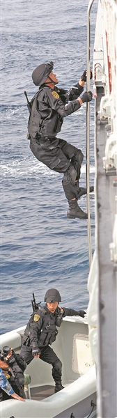 伴著一陣刺耳的警報(bào)聲,海軍第35批護(hù)航編隊(duì)特戰(zhàn)分隊(duì)一場(chǎng)武力營(yíng)救演練打響??罩袘?zhàn)鷹盤旋警戒,海上兩艘小艇搭乘數(shù)名特戰(zhàn)隊(duì)員快速抵近“被劫持商船”。掛梯、攀爬、翻越欄桿,特戰(zhàn)隊(duì)員動(dòng)作干凈利落,上船后隨即展開艙室搜索、解救人質(zhì)等課目演練。現(xiàn)場(chǎng)氣氛緊張,驚心動(dòng)魄,特戰(zhàn)隊(duì)員以迅雷之勢(shì)果斷突擊,將“劫匪”一舉殲滅,成功解救“被劫持商船”。