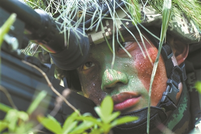 圖③:夏日炎炎,武警廣東總隊某執(zhí)勤支隊特戰(zhàn)中隊狙擊手劉欽明在叢林中潛伏。