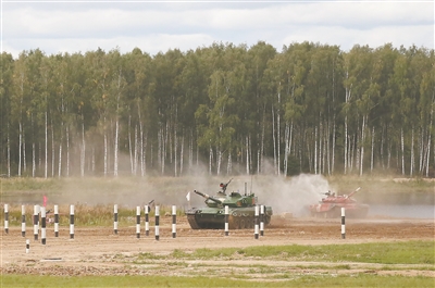 9月1日,在“坦克兩項(xiàng)”項(xiàng)目半決賽中,我軍參賽隊703車組在賽道上疾馳。