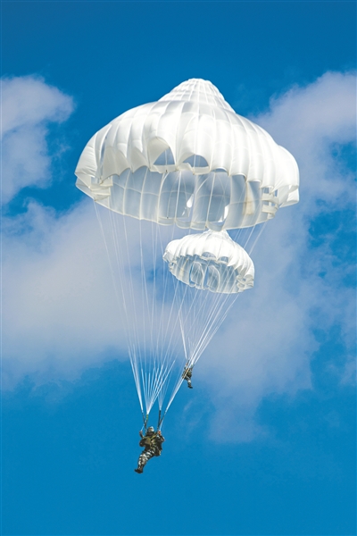 飛抵預(yù)定空域,在抗“藍軍”反空降火力掩護下,裝備物資首先投放,全副武裝的學(xué)員緊隨其后實施集群傘降,朵朵傘花在天空競相綻放。