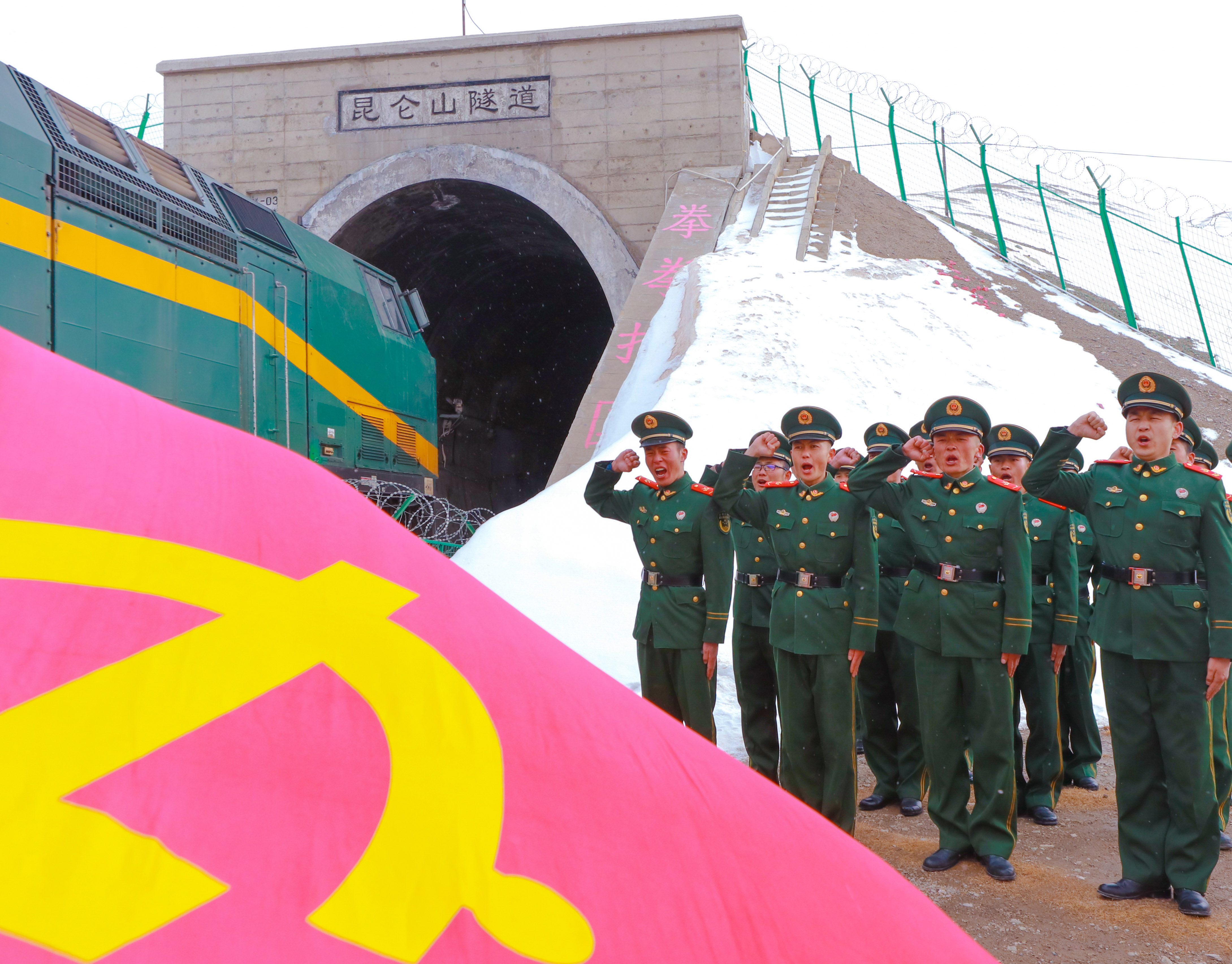 圖為官兵在海拔4774米的青藏鐵路昆侖山隧道口,向黨旗宣誓。楊志升 攝