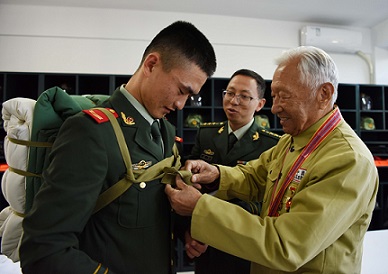 圖為在武警合肥支隊執(zhí)勤十八中隊應急班,抗美援朝老戰(zhàn)士鄭尊禮(右)向戰(zhàn)士們演示完打背包后,給戰(zhàn)士李文強整理背包。