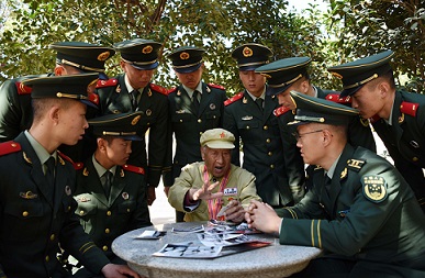圖為抗美援朝老戰(zhàn)士鄭尊禮(中)在給武警合肥支隊執(zhí)勤五大隊官兵講述出國入朝作戰(zhàn)經(jīng)歷。