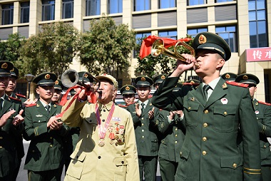剛擔任司號員不久的下士孔祥輝主動跟鄭尊禮取經(jīng),學習軍號吹奏經(jīng)驗。兩人一起合奏沖鋒號,把現(xiàn)場官兵帶回那個硝煙彌漫的戰(zhàn)場。