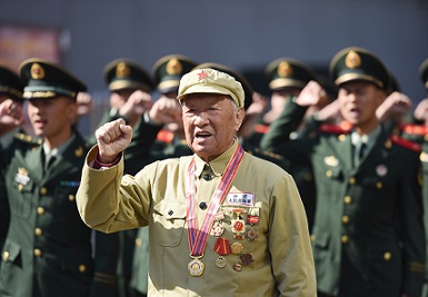 圖為抗美援朝老戰(zhàn)士鄭尊禮(前)與武警合肥支隊執(zhí)勤五大隊官兵一起重溫軍人誓詞。