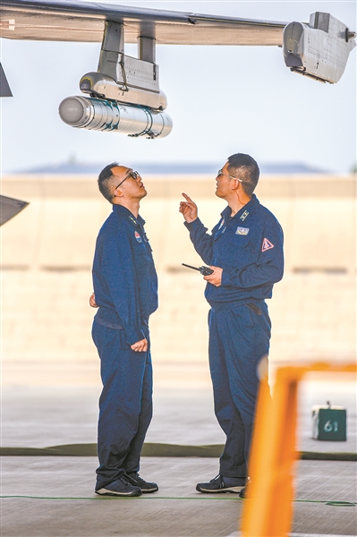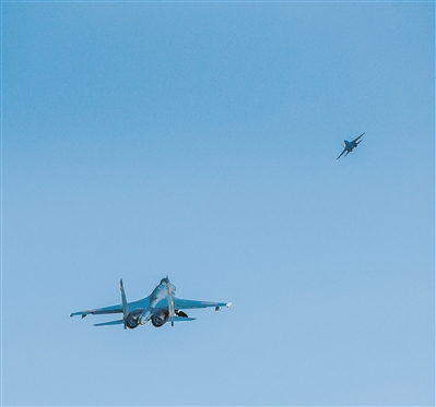 翻轉(zhuǎn)、規(guī)避、俯沖……殷凡明接連使出高難度動(dòng)作,與“敵”機(jī)纏斗,為僚機(jī)實(shí)施進(jìn)攻創(chuàng)造條件。張瑋則機(jī)動(dòng)迂回,伺機(jī)從側(cè)翼發(fā)起攻擊。