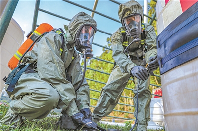 12月上旬,武警廣西總隊機(jī)動支隊緊貼任務(wù)實際,組織防化分隊圍繞快速出動、有害物質(zhì)偵檢、戰(zhàn)場洗消等內(nèi)容展開防化應(yīng)急演練,提高官兵應(yīng)對各類突發(fā)情況的綜合處置能力。圖為對“泄漏”罐體進(jìn)行封堵。 余海洋攝影報道
