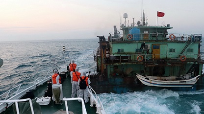 圖為海警執(zhí)法艦艇堵截嫌疑船舶。中國海警局供圖