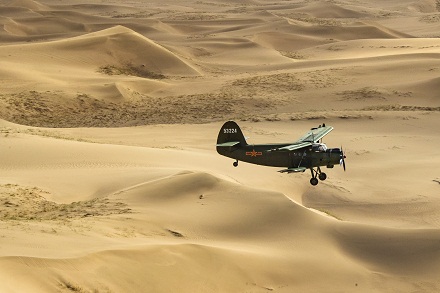 圖為官兵駕駛運(yùn)-5飛機(jī)在騰格里沙漠上空飛播造林。劉暢 攝