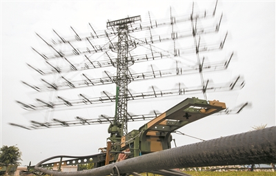 操作方艙內(nèi),各號(hào)手屏氣凝神?!胺轿弧痢粒嚯x××,發(fā)現(xiàn)目標(biāo)!”參謀人員迅速報(bào)告“敵情”。話音未落,“敵”機(jī)對(duì)地面雷達(dá)釋放強(qiáng)電磁干擾,并伺機(jī)向陣地逼近。