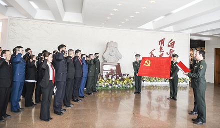 在雷鋒紀(jì)念館前,沈陽(yáng)軍事法院院長(zhǎng)陶韜、遼寧省高級(jí)人民法院副院長(zhǎng)任延忠等50余名軍地法官面向黨旗莊嚴(yán)宣誓,重溫入黨誓詞。