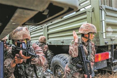 “全班注意!前方發(fā)現(xiàn)‘敵’情……”研判目標區(qū)域態(tài)勢后,班長馮坤娜下達作戰(zhàn)命令。隨即,狙擊手快速占領(lǐng)高地,對“敵”進行警戒;無人機操作手放飛無人機實施偵察,將相關(guān)信息實時上報指揮中心;突擊組向“敵”警戒區(qū)域隱蔽滲透……