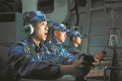 夜幕降臨,編隊轉(zhuǎn)入反潛訓(xùn)練?!胺轿弧痢?,距離××,發(fā)現(xiàn)金屬回音!”經(jīng)過仔細搜索,某艦發(fā)現(xiàn)“敵”潛艇,迅速通報編隊其他艦艇并對其實施打擊。