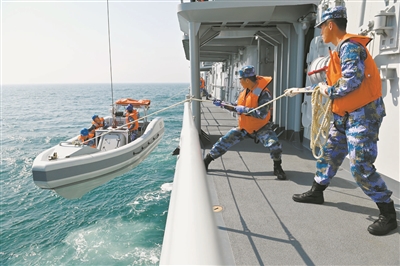 編隊抵達某海域后,又展開一場救生演練?!坝蚁嫌腥寺渌?,救生部署!”哈爾濱艦官兵迅速吊放右側小艇,4名救生員駕駛小艇抵達目標位置,成功將落水人員救起。