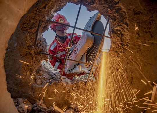 圖為救援分隊官兵采取安全破拆開辟救援通道。