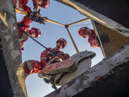 圖為官兵利用內(nèi)燃無齒鋸進(jìn)行快速破拆。
