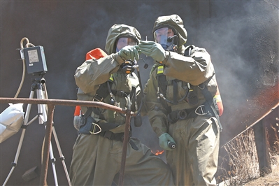 “3名‘暴恐分子’藏匿于化工廠二樓!”晨曦微露,偵察隊(duì)員段鳳喬一邊報(bào)告?zhèn)刹烨闆r,一邊掩護(hù)防化分隊(duì)?wèi)?zhàn)友對(duì)廠區(qū)泄漏化學(xué)物質(zhì)進(jìn)行處理。