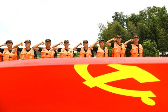 2020年7月18日,武警上饒支隊“00”后戰(zhàn)士王子浩在抗洪一線光榮入黨,面對黨旗,莊嚴宣誓。池小強 攝