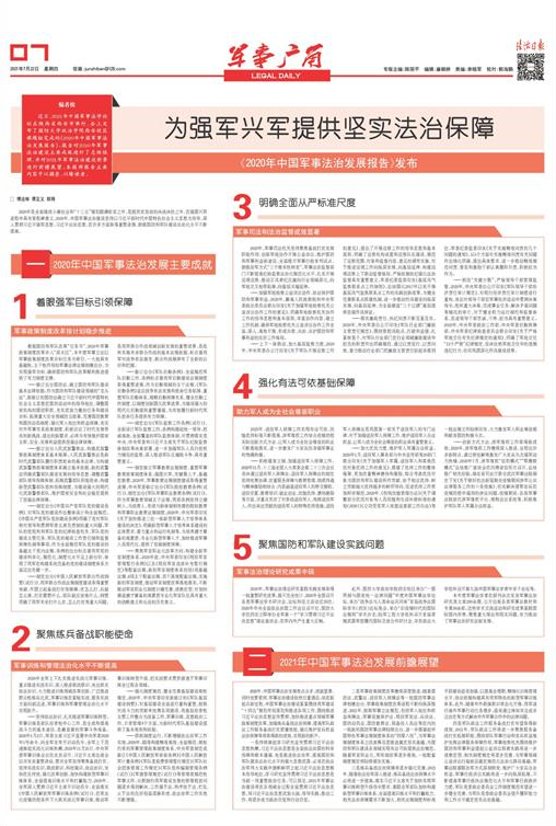 近日,2021年中國軍事法學(xué)論壇在陜西省西安市舉行,會上發(fā)布了國防大學(xué)政治學(xué)院西安校區(qū)課題組完成的《2020年中國軍事法治發(fā)展報告》。報告對2020年軍事法治建設(shè)主要成就進行了總結(jié)梳理,并對2021年軍事法治建設(shè)前景進行前瞻展望。本報將報告主要內(nèi)容予以摘登,以饗讀者。