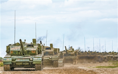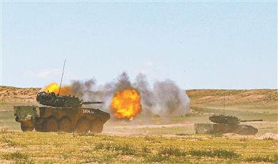 某型突擊車在機(jī)動中對“敵”實(shí)施火力打擊。