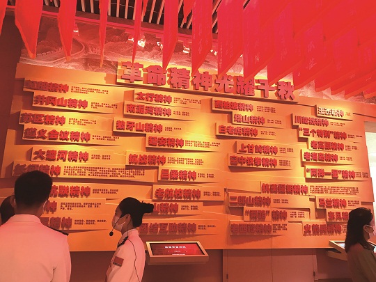 在這面革命精神展墻上,“革命精神光耀千秋 紅色基因代代相傳”紅色大字,向來往的參觀者展示著人民軍隊(duì)永不磨滅的紅色精神。