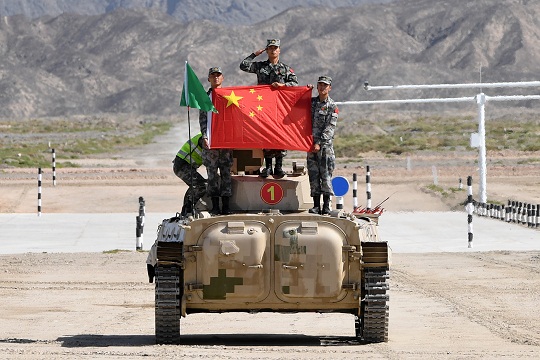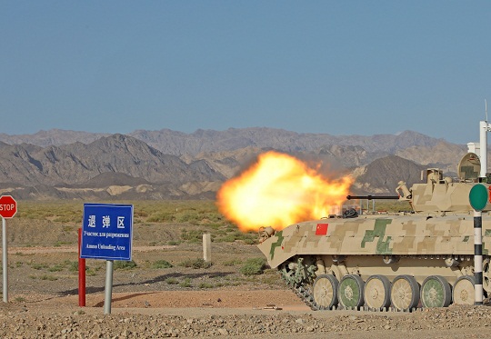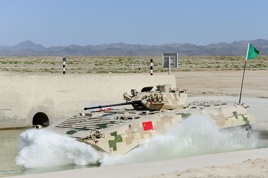 圖為中國參賽隊員駕駛步戰(zhàn)車駛?cè)肷嫠畧觥M蹩?攝