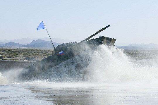 中國車組快速通過機(jī)動越障路段后,漂移進(jìn)入射擊陣位,三名參賽隊員領(lǐng)彈、裝彈一氣呵成,隨著“砰砰”聲響,遠(yuǎn)方5個隨機(jī)顯示的靶標(biāo)應(yīng)聲而倒。白俄羅斯車組第四個出場,駛出射擊陣位,戰(zhàn)車一路飛馳,快速轉(zhuǎn)彎后,加速沖入涉水場,激起數(shù)米高的水花。