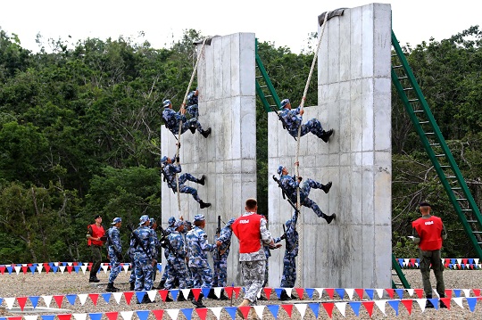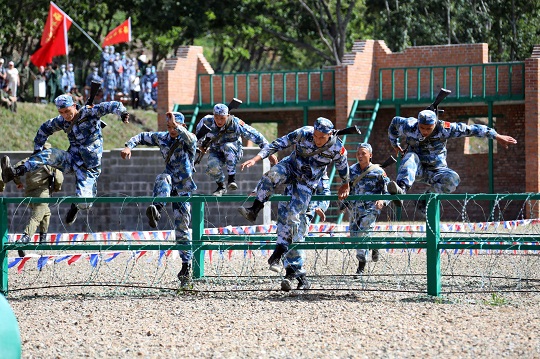 圖為中國(guó)參賽隊(duì)陸戰(zhàn)一班和三班跨越混凝土墻。肖勇利 攝