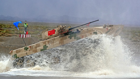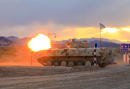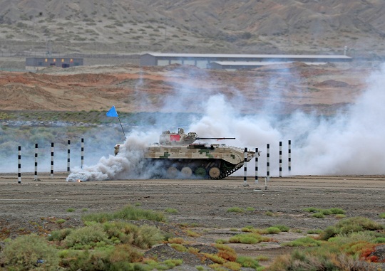 圖為中國參賽隊(duì)駕駛步戰(zhàn)車通過煙火路段。羅興倉 攝