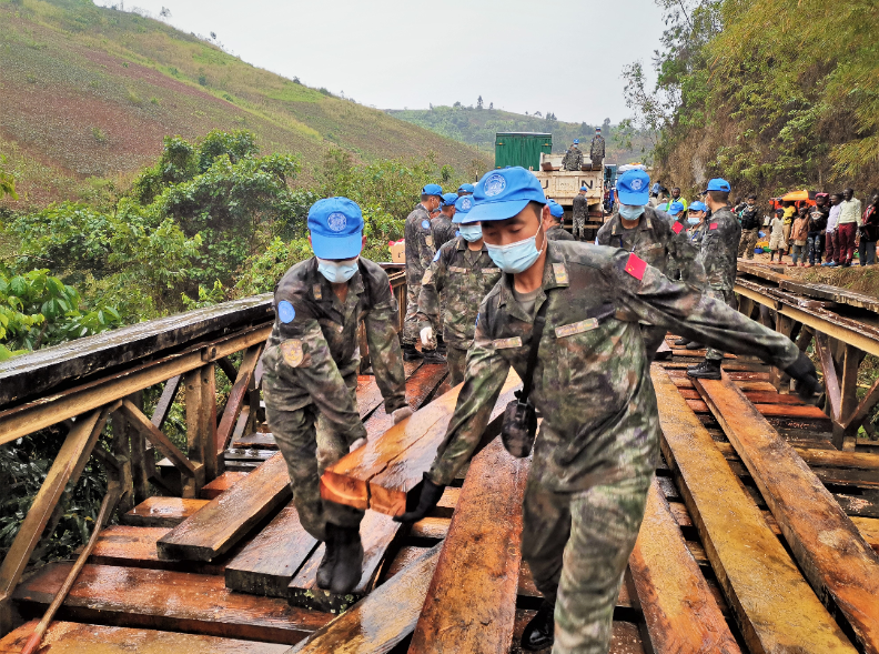中國第24批赴剛果(金)維和部隊由工兵、醫(yī)療兩支分隊組成,自去年9月輪換部署一年來,積極應(yīng)對多重考驗,出色完成道路修復(fù)、橋梁搶修、人道主義救援、衛(wèi)生防疫等任務(wù)。兩支分隊以杰出的工作成績,受到聯(lián)合國剛果(金)穩(wěn)定特派團和當(dāng)?shù)卣叨仍u價。歸國前,218名官兵均被授予聯(lián)合國“和平勛章”,表彰他們?yōu)榫S護世界和平作出的貢獻。