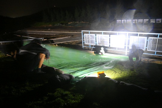處于海南島最東端的銅鼓嶺測(cè)控點(diǎn),三面環(huán)山、風(fēng)大浪高,地勢(shì)的原因讓這里的防臺(tái)形勢(shì)更加嚴(yán)峻。曾經(jīng),2014年臺(tái)風(fēng)“威馬遜”登陸時(shí),中心風(fēng)力達(dá)17級(jí)。為拯救光學(xué)實(shí)況記錄設(shè)備,測(cè)控點(diǎn)成立突擊小分隊(duì),在狂風(fēng)暴雨中用繩索相互捆綁,成功保住了測(cè)控設(shè)備。這次臺(tái)風(fēng)過(guò)境,點(diǎn)號(hào)航天工作者更是未雨綢繆,提前開(kāi)展臺(tái)風(fēng)形勢(shì)研判,實(shí)地查看風(fēng)險(xiǎn)隱患和防范重點(diǎn)難點(diǎn),緊前加固設(shè)備天線(xiàn)罩,加蓋防雨布層層保護(hù)核心部位,力爭(zhēng)設(shè)備設(shè)施零損失。12日晚,連夜的暴雨導(dǎo)致測(cè)控點(diǎn)綠化斜坡松動(dòng),應(yīng)急分隊(duì)聞令而動(dòng),冒著大雨全力疏通泄洪渠道,壓緊壓實(shí)斜坡,及時(shí)避免了可能帶來(lái)的斜坡塌方和建筑損傷。