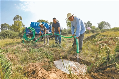 張連印(右一)與老伴王秀蘭、兒子張曉斌一起為樹苗澆水。