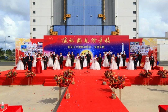 2020年10月1日,當中秋遇上國慶,中心在西昌和文昌發(fā)射場,為52對航天新人同步舉行“讓祖國見證幸?!奔w婚禮。