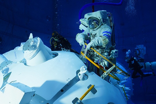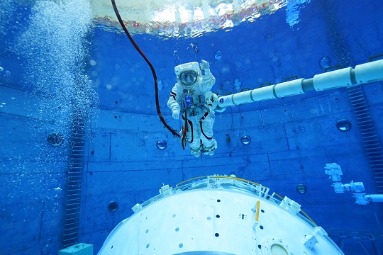 圖為如臨深空—2021年8月25日翟志剛水下訓練在機械臂上移動。孔方舟 攝