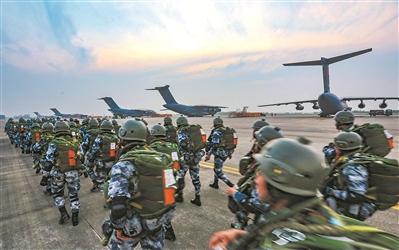 拂曉,某軍用機(jī)場(chǎng),數(shù)百名傘兵迅速完成傘具整理和武器裝備披掛,空降空投骨干對(duì)重型裝備和空投物資進(jìn)行裝載加固。通過3道檢查線后,傘兵們按照戰(zhàn)斗編組登上戰(zhàn)機(jī)。伴著震耳的轟鳴聲,多種機(jī)型運(yùn)輸機(jī)編隊(duì)依次升空,飛赴預(yù)定空域。
