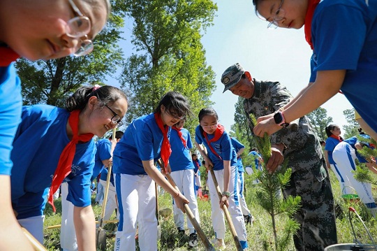 圖為張連印帶著孩子們植樹(shù)造林。丁美寧 攝