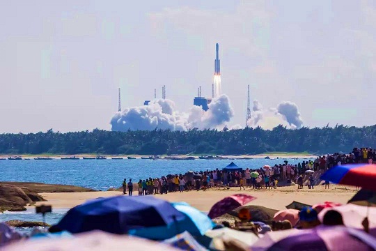 今年9月20日,海灘上、椰林旁、山頂上人山人海。伴隨著一陣山呼海嘯般的巨響,長征七號火箭托舉著天舟三號貨運(yùn)飛船一飛沖天,中國空間站建設(shè)進(jìn)入承上啟下的關(guān)鍵一步。人們揮舞著國旗、高唱愛國歌曲、眼含熱淚,目送“天舟”奔赴太空。那個下午,騰飛的火箭與碧海藍(lán)天,歡呼的人群與紅色旋律,構(gòu)成了一幅中華民族探索浩瀚宇宙的壯美畫卷。