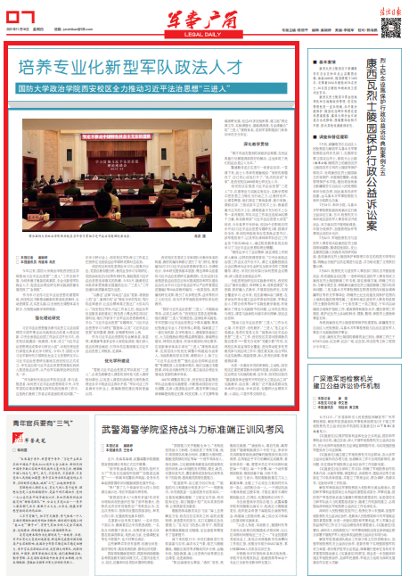 習近平法治思想蘊含著馬克思主義法治原理同中國軍事法治實踐相結(jié)合的重大理論創(chuàng)新。中央全面依法治國工作會議召開后不久,西安校區(qū)就遴選一批教授、專家,成立“習近平法治思想理論成果學習研究小組”,對相關(guān)理論進行深度化體系化學習研究。今年1月,國防大學習近平新時代中國特色社會主義思想研究中心習近平法治思想研究基地在西安校區(qū)正式成立,率先走出將習近平法治思想貫徹落實到深入推進依法治軍、從嚴治軍實踐理論研究的堅實一步。