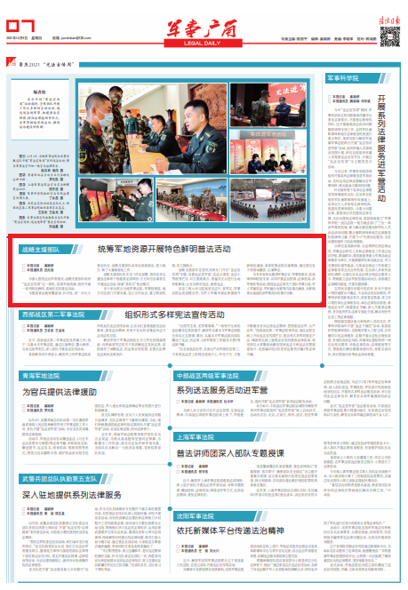 為提高普法教育覆蓋面、針對(duì)性,進(jìn)一步壯大普法隊(duì)伍,戰(zhàn)略支援部隊(duì)各單位因地制宜、借力地方,做了大量基礎(chǔ)性工作。