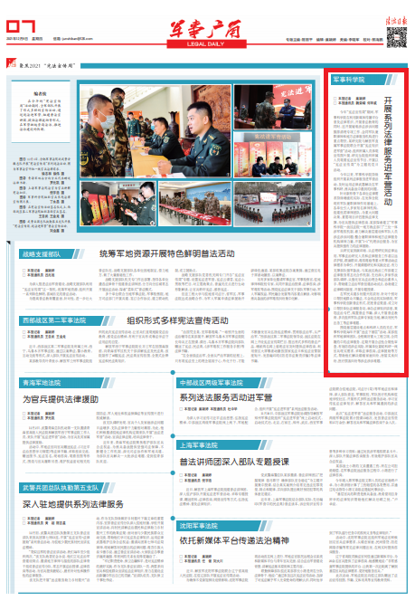 在軍民共建鄉(xiāng)村振興的農(nóng)村,針對(duì)個(gè)別對(duì)口幫扶地群眾不懂法、不會(huì)用法的實(shí)際情況,軍事科學(xué)院創(chuàng)新普法形式,拓寬普法渠道,成立對(duì)口幫扶單位法律服務(wù)站,舉辦法律知識(shí)講座、策劃法治專(zhuān)欄、購(gòu)置普法書(shū)籍,深入開(kāi)展普法教育。多次組織軍隊(duì)法律專(zhuān)家赴當(dāng)?shù)兀鉀Q村民外出務(wù)工等法律難題。