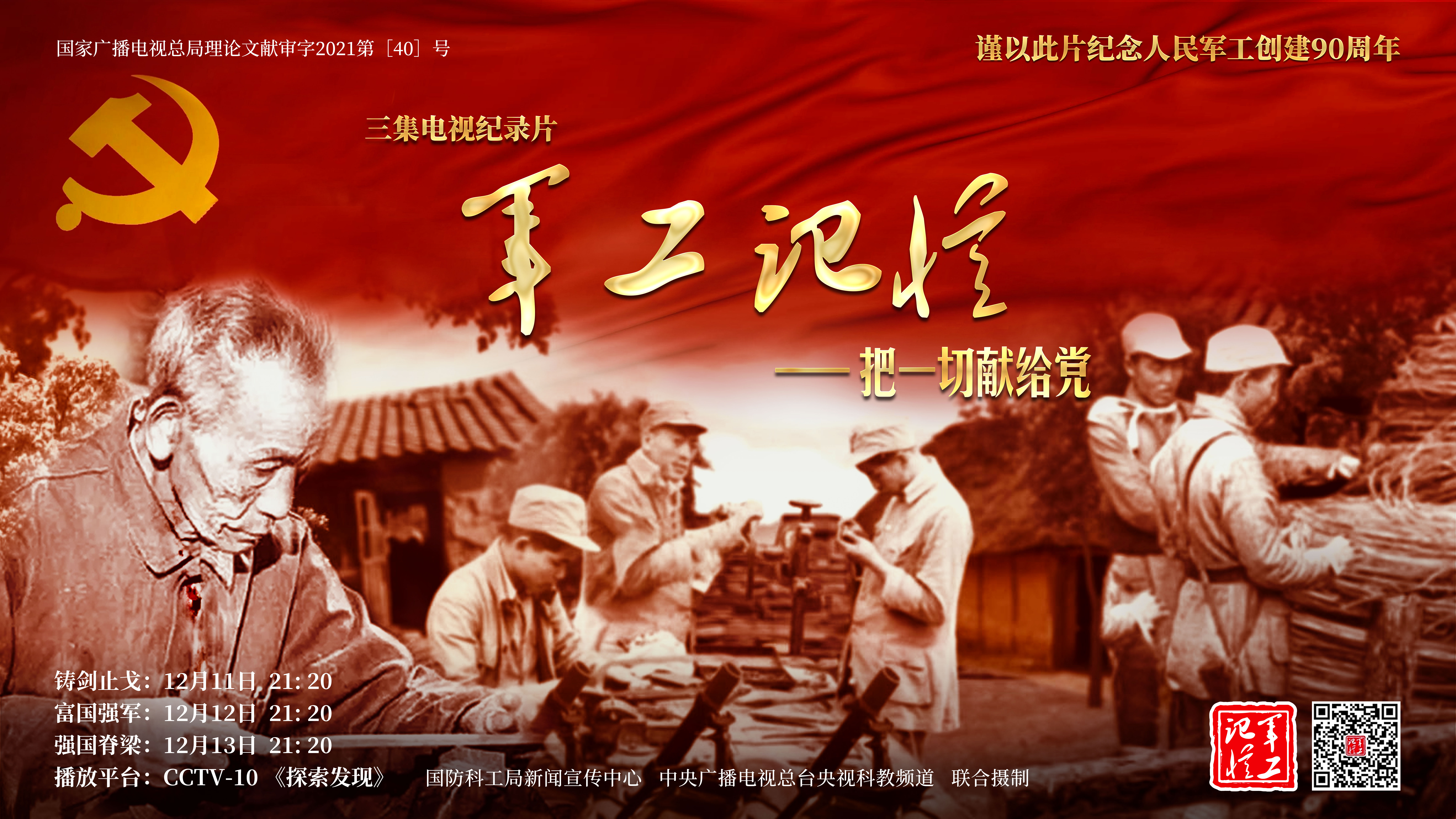 為慶祝中國共產(chǎn)黨成立100周年,紀(jì)念黨領(lǐng)導(dǎo)下的人民軍工創(chuàng)建90周年,由國防科工局指導(dǎo),國防科工局新聞宣傳中心聯(lián)合中央廣播電視總臺社教節(jié)目中心攝制,各軍工集團大力支持的3集重大理論文獻電視紀(jì)錄片《軍工記憶——把一切獻給黨》,將于12月11日21:20在央視科教頻道(CCTV-10)《探索發(fā)現(xiàn)》欄目首播,連續(xù)播出3天。該紀(jì)錄片旨在向建黨百年獻禮,向人民軍工90周年致敬,向全社會弘揚軍工精神傳遞軍工文化,激勵國防科技工業(yè)戰(zhàn)線廣大干部職工不忘初心、接續(xù)奮斗,為實現(xiàn)強軍強國夢想貢獻力量。