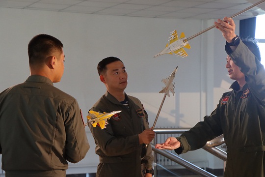 圖為海軍航空大學(xué)某基地組織地面演練,這是飛行教官丁陽(右一)正用飛機(jī)模型教授學(xué)員戰(zhàn)術(shù)動(dòng)作。趙天淏 攝
