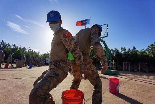 春節(jié)期間,中國第九批赴馬里維和工兵分隊組織了戰(zhàn)備演練。圖為營區(qū)警報響后,快反組迅速領取武器彈藥,占領預定位置,進入嚴密戒備狀態(tài)。王宏陽 攝