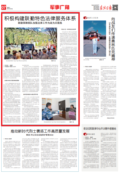 “聯(lián)勤保障部隊(duì)平時(shí)從事軍需能源、醫(yī)療衛(wèi)勤、物資采購、資產(chǎn)儲備等軍事經(jīng)濟(jì)工作,戰(zhàn)時(shí)涉及武器彈藥運(yùn)送、藥品耗材訂購、民用物資和設(shè)施征用等諸多法律事務(wù),法律服務(wù)工作必須具備全天候、全方位保障能力?!甭?lián)勤保障部隊(duì)領(lǐng)導(dǎo)介紹說,他們多維設(shè)計(jì)構(gòu)建“三位一體”聯(lián)勤法律服務(wù)體系,積極打造特色法治品牌。