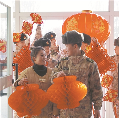 王萬(wàn)果夫婦與連隊(duì)官兵一起貼春聯(lián)、掛燈籠,營(yíng)造節(jié)日喜慶氛圍。