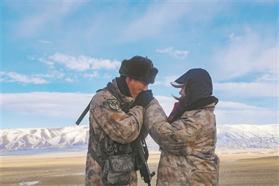 巡邏途中休息時(shí),宣偉為妻子歐陽(yáng)冬梅焐手取暖。