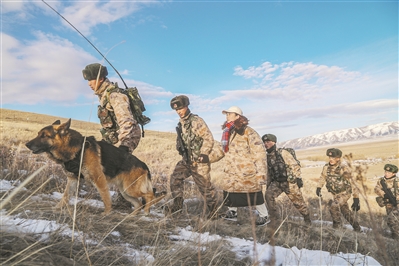 軍嫂歐陽(yáng)冬梅跟著丈夫宣偉(左二)和戰(zhàn)友巡邏,體驗(yàn)戍守邊關(guān)的艱辛。
