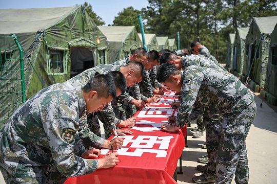 圖為官兵在“強(qiáng)化國家安全意識(shí) 推進(jìn)強(qiáng)軍興軍偉業(yè)”條幅上簽名。